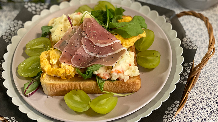 海老とアボカドとまんまる卵焼きのピリ辛オープンサンド